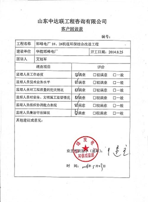 云南華電鎮(zhèn)雄電廠超低排放改造項目客戶回訪表