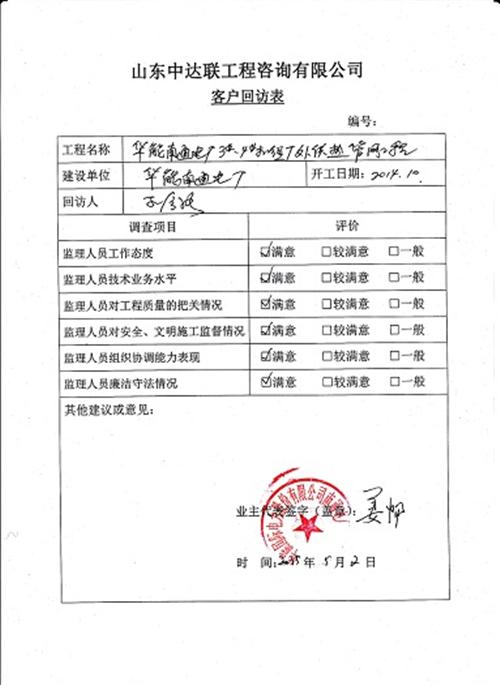 華電淄博熱電有限公司回訪表